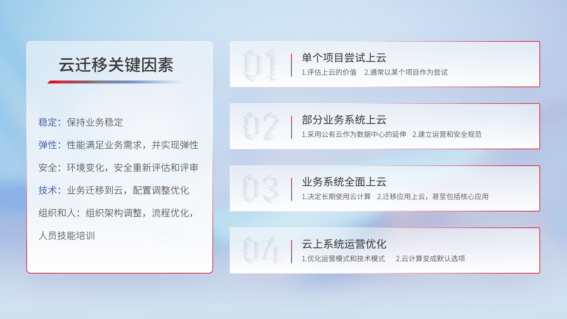 结合实际业务,,,,从规划设计、、、云平台选型、、云原生改造、、数据迁移、、集成交付,,,迁移全过程为客户识别最佳上云路径,,做好风险识别管理,,设计网络架构、、、身份权限、、安全审计合规、、操作审计、、、日志审计、、监控告警策略、、多站点容灾设计等,,,,对云上基础设施进行整体规划,,,,提升IT治理水平,,以满足弹性、、、、高可用、、高性能的需求。。