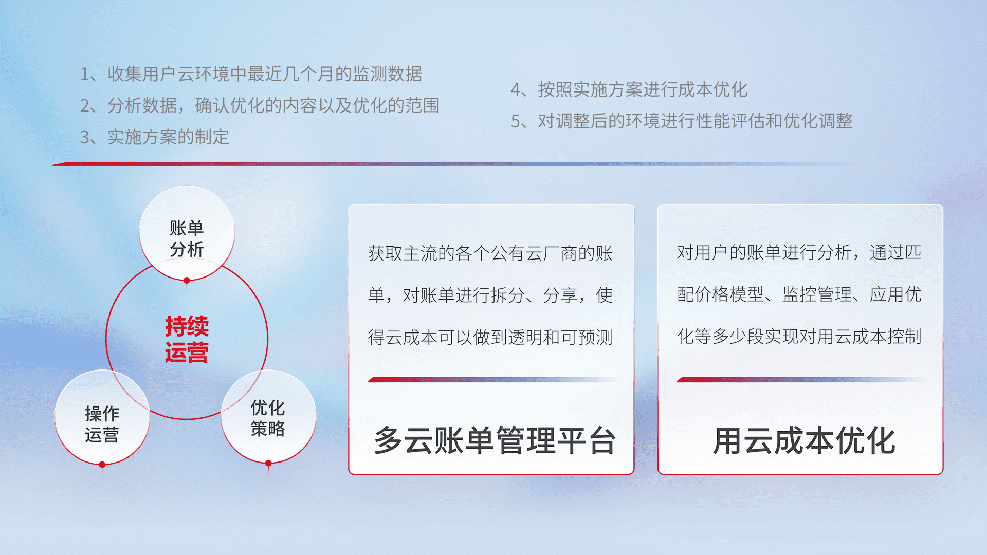 通过多云纳管,,,,以统一的资源数据模型把客户的云资源进行抽象和封装,,,,进而实现对多云资源的统一操作,,保障云资源管理的可靠性、、、、稳定性与可用性。。量身定制化运维内容,,,配置、、、开发运维、、补丁管理、、备份、、、监控、、、认证和访问管理、、、、审计和日常巡检等,,,保障在用云过程中的可靠度,,,,稳定度以及高可用率。。。