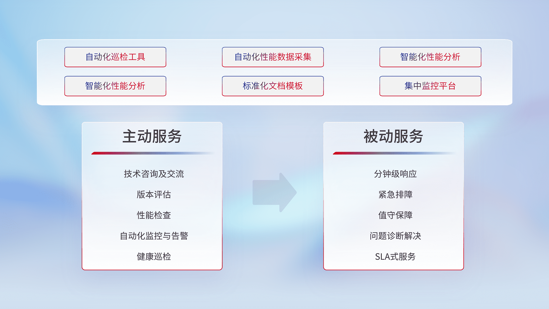 智能化工具和标准化文档,,,,保障服务质量,,提供主动服务(包含技术咨询、、、、版本评估、、性能检查、、自动化监控与告警、、、、健康巡检)和被动服务包含(分钟级响应、、紧急排障、、值守保障、、、、问题诊断解决、、、SLA服务)。。。